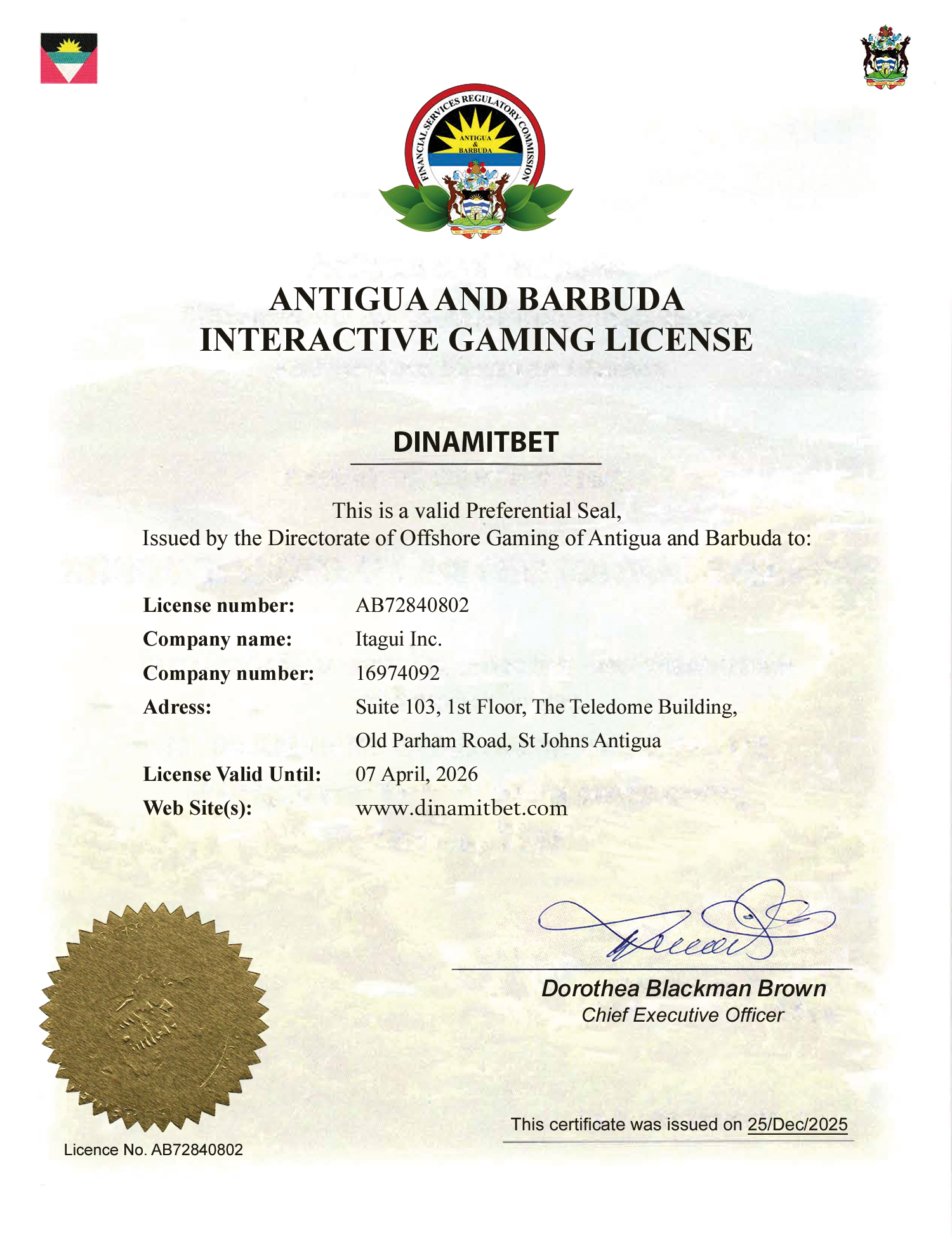 dinamitbet425.com to dinamitbet3425.com, operated by Itagui Inc., a company incorporated under the laws of Antigua and Barbuda with Company Number 16974092 holds a valid Certificate of Operation.